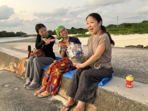 渡口の浜の夕暮れどき、アマカゲストのSさんとKさんがお祝いの花束とジミーのアップルパイをプレゼントしました。